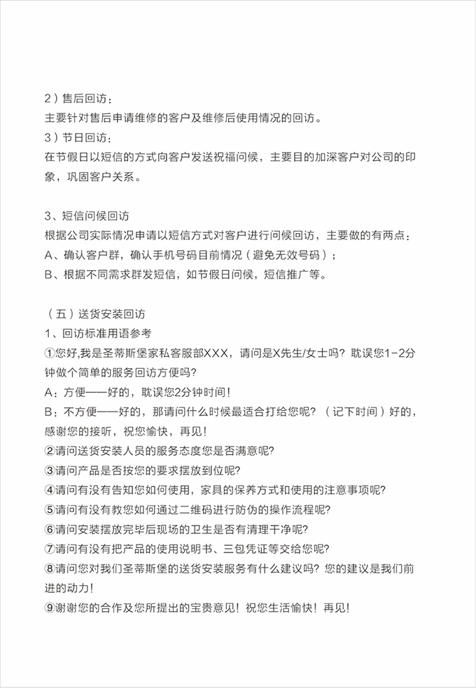 话术参考:“**先生/女士您好,我是MK体育的售后服务人员**,您购买的MK体育家具已经全部到货了,送货安装大约需要**时间,请问您这边什么时候方便我们上门送货安装呢?”同时要了解送货小区的电梯、楼道、入户门的尺寸等,提前做好准备,避免意外情况。最后确定送货时间(安装所需要时长),并告知客户安装人员的相关信息,可加微信发送,并发送配送安装流程说明。