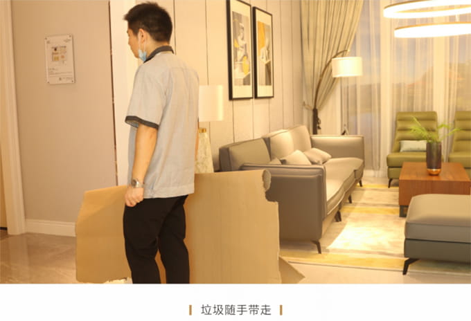产品安装确认无误后及时清理房间内因安装产生的垃圾并保持空气流畅,然后用干净的抹布将家具擦拭一遍,确保产品清洁,用吸尘器对安装环境进行清理,并对所有安装好的产品拍摄记录作为完工效果备案。